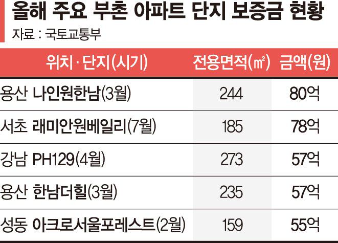 국토부 자료를 보면 올해 들어 서울에서 지난 9월까지 전세보증금 50억원 이상 거래는 총 20건이다. 지역별로 보면 용산구 한남동과 성동구 성수동에 몰려있다. 한남에서는 '한남더힐' 전용 235㎡가 올 3월 57억원에 전세계약이 체결됐다. 성수동에서는 '갤러리아포레'와 '아크로서울포레스트'에서 고액 전세 계약이 이뤄졌다. 이곳에서 최고가 보증금은 지난 2월 '아크로서울포레스트' 전용 159㎡로 55억원이다. 강남에서 서초구 반포동 '래미안원베일리'에서 고액 전세 계약이 이뤄졌다. 전용 185㎡가 지난 7월 78억원에 임차인을 찾으며 올해 거래 2위를 차지했다.