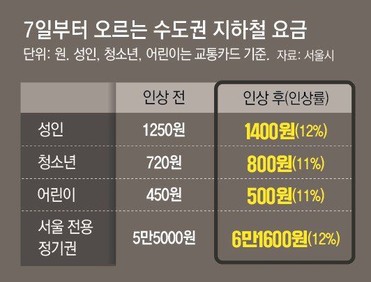 서울시 등은 지하철 기본요금 인상안을 7일부터 시행한다고 2일 밝혔다. 인상안에 따르면 교통카드 기준으로 성인 기본요금은 1250원에서 1400원으로 12% 오른다. 청소년(중학생·고등학생)은 720원에서 800원으로, 어린이(초등학생)는 450원에서 500원으로 각각 11%가량 인상된다. 지하철 성인 기본요금이 오르는 건 2015년 이후 8년 만이고, 청소년·어린이 요금이 오르는 건 2007년 이후 16년 만이다.