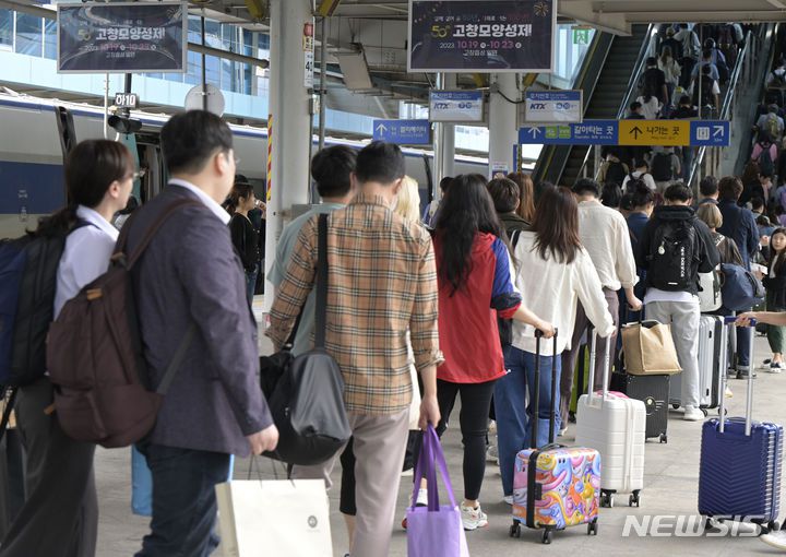 [광주=뉴시스] 변재훈 기자 = 추석 연휴를 하루 앞둔 27일 오전 광주 광산구 KTX광주송정역에 도착한 용산발 KTX열차에서 내린 귀성객들이 줄지어 이동하고 있다. 2023.09.27. wisdom21@newsis.com