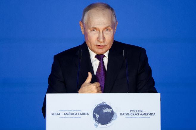 블라디미르 푸틴 러시아 대통령이 9월 29일(현지시간) 모스크바에서 열린 러시아-라틴 아메리카 국제의회 콘퍼런스에서 연설을 하고 있다. / 타스 연합뉴스