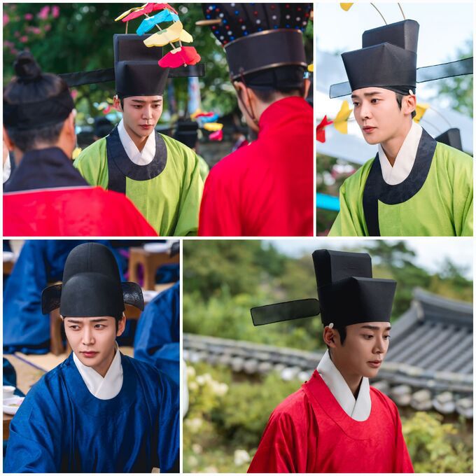 이와 관련 ‘혼례대첩’ 로운이 ‘조선 최고의 울분남’으로 등극한 심정우의 핵심적인 면면들을 담은 장면들이 시선을 강탈한다. 극 중 심정우(로운)가 장원급제복과 혼례복을 입은 모습으로 ‘울분의 시작’을 알리는 장면. 심정우는 수많은 선비들이 도전한 과거 시험장에서 명석한 두뇌와 돌직구 팩폭으로 다른 선비들을 압살하는 저력을 발휘한다. 이어 최연소 장원급제 후 장원급제자들의 맨 앞자리를 당당히 차지하며 확고한 포부를 내비쳐 미워할 수 없는 야망 캐릭터임을 드러낸다.