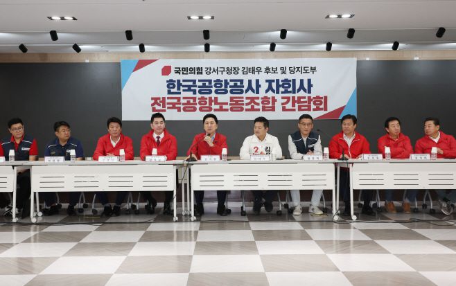 김기현 국민의힘 대표는 3일 서울 강서구에서 열린 김태우 서울 강서구청장 후보 초청 한국공항공사 자회사 전국공항노동조합 간담회에 참석했다. 이 자리에는 김태우 후보와 김 대표를 비롯해 김가람 최고위원, 강대식 최고위원, 김선동 서울시당위원장, 박성민 전략기획부총장 등 당 지도부가 여럿 자리했다.