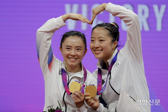 전지희(왼쪽)와 신유빈이 지난 2일 중국 항저우 중국 항저우 궁슈 캐널 스포츠파크 체육관에서 열린 탁구 여자 복식 결승전에서 금메달을 획득한 뒤 시상대에서 포즈를 취하고 있다. 항저우 l 문재원 기자 |