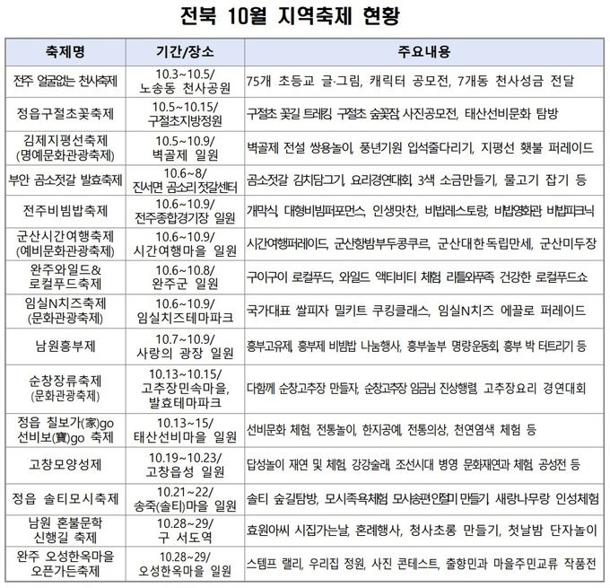 이 밖에도 전북에서는 ‘부안 곰소젓갈 발효축제’(6∼8일), ‘고창모양성제’(19∼23일) 등 크고 작은 축제가 줄을 잇는다.