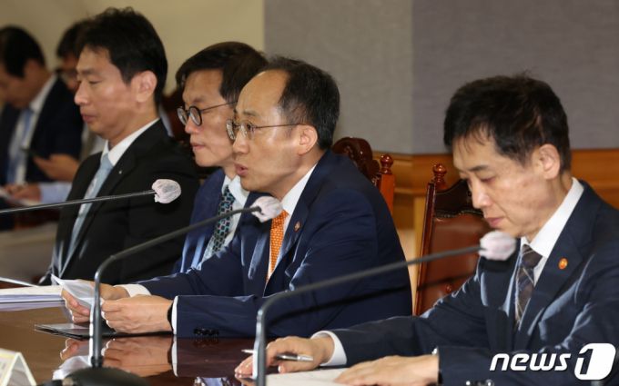 (서울=뉴스1) 김민지 기자 = 추경호 경제부총리 겸 기획재정부 장관이 21일 오전 서울 중구 은행회관에서 열린 비상 거시경제금융회의에서 모두 발언을 하고 있다. 왼쪽부터 이복현 금감원장, 이창용 한국은행 총재, 추 부총리, 김주현 금융위원장. 2023.9.21/뉴스1 Copyright (C) 뉴스1. All rights reserved. 무단 전재 및 재배포, AI학습 이용 금지. |