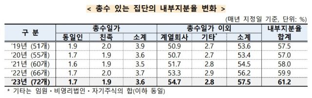 이 가운데 총수가 있는 72개 집단(2889개 계열사)의 내부지분율은 61.2%였다. 전년(59.9%) 대비 1.3%포인트 증가해 처음으로 60%를 넘었다. 세부 내역을 보면 총수일가 지분은 3.6%였고 계열회사 지분은 54.7%로 나타났다.