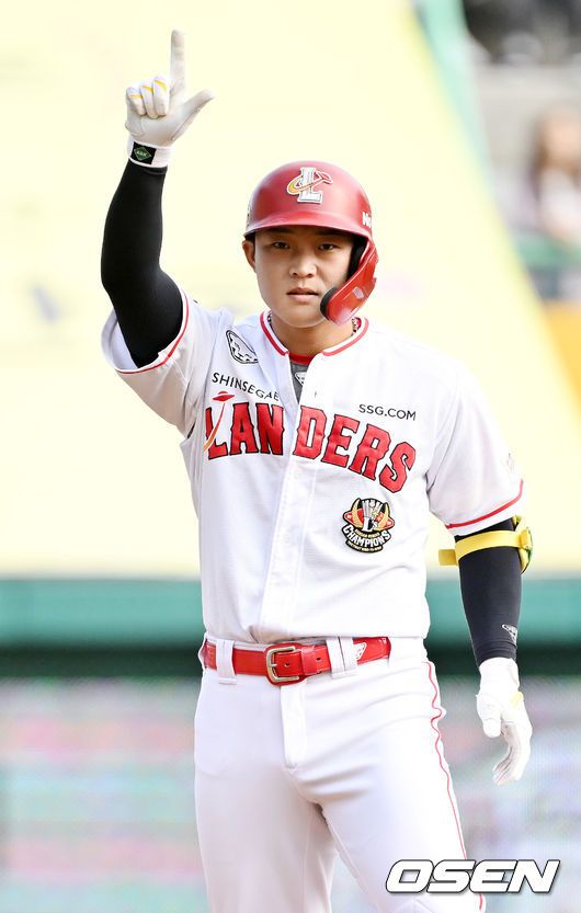 5회말 1사 주자 1,3루 SSG 김찬형이 우익수 오른쪽 1타점 적시 2루타를 때린 후 2루에서 기뻐하고 있다. 2023.10.03 / rumi@osen.co.kr