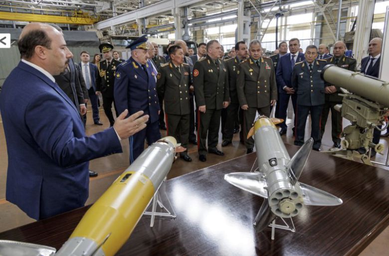세르게이 쇼이구 러시아 국방장관(가운데 우측)이 독립국가연합의 국방장관들과 지난달 30일(현지시간) 러시아 툴라의 군수 공장을 견학하고 있는 모습.AP뉴시스