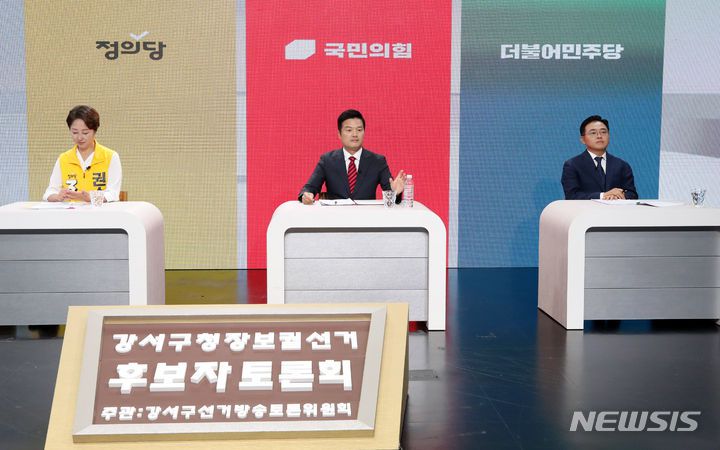 [서울=뉴시스]최영서 신귀혜 기자 = 서울 강서구청장 보궐선거거가 8일 앞으로 다가온 가운데 김태우 국민의힘 후보와 진교훈 더불어민주당 후보가 첫 TV토론회에서 치열한 공방을 벌였다.