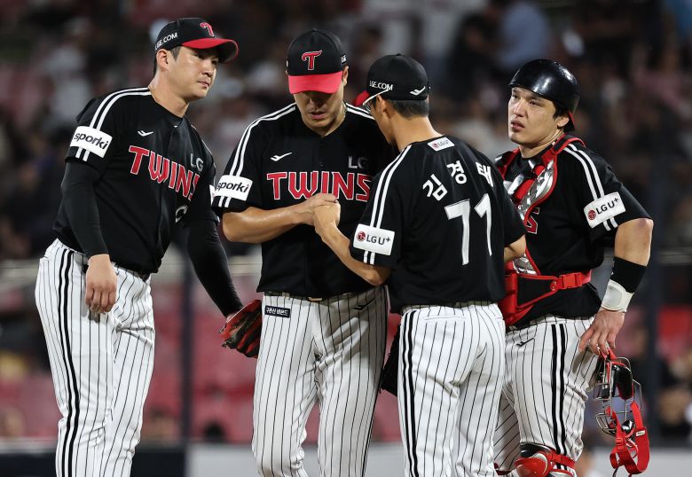 지난달  6일 오후 경기 수원시 장안구 KT위즈파크에서 열린 LG 트윈스와 KT 위즈의 경기에서 LG 김진성이 8회말 2사 1루 상황에서 교체되고 있다..뉴스1