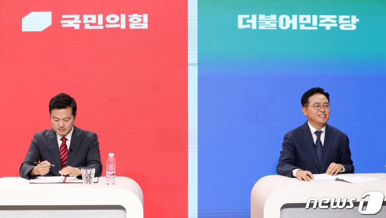 진교훈 더불어민주당(오른쪽), 김태우 국민의힘 강서구청장 보궐선거 후보자가 2일 오후 서울 강서구 SK브로드밴드 스튜디오에서 열린 TV 토론회에 참석해 토론 준비를 하고 있다.(공동취재) 2023.10.2/뉴스1 ⓒ News1 황기선 기자 |