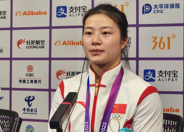 중국 역도 신예 페이신이(18)가 지난 2일 중국 저장성 항저우 샤오산 스포츠센터에서 열린 2022 항저우 아시안게임 역도 여자 64㎏급에서 2위에 오른 뒤, 메달리스트 기자회견 중 중국 취재진의 질문을 듣고 있다. /연합뉴스