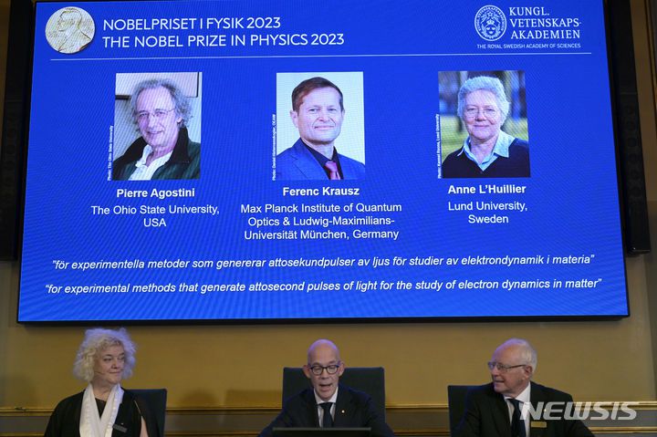 [스톡홀름=AP/뉴시스]스웨덴 왕립과학원 노벨위원회가 3일(현지시간) 스톡홀름에 위치한 왕립과학원에서 올해 노벨 물리학상 수상자로 피에르 아고스티니, 페렌츠 크라우스, 안 륄리에가 선정됐다고 발표하고 있다. 2023.10.03.