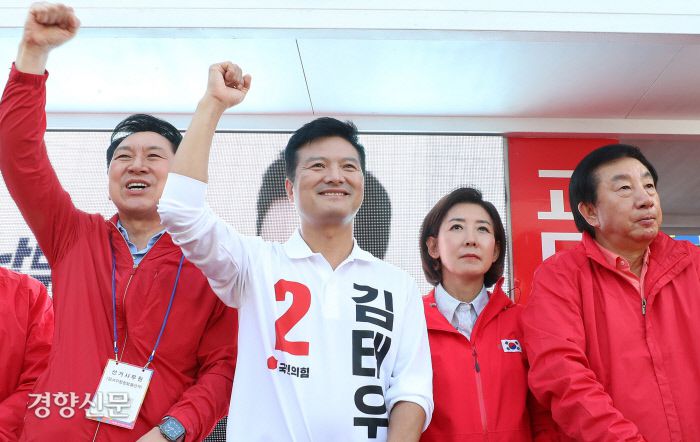 서울 강서구청장 보선 D-7, 정국 분수령…여야 총력전 서울 강서구청장 보궐선거를 일주일여 앞둔 3일 김태우 국민의힘 후보(왼쪽에서 두번째)가 서울 강서구 방화사거리에서 김기현 당대표(왼쪽) 등 지도부와 함께 선거 유세를 하고 있다. 권도현 기자