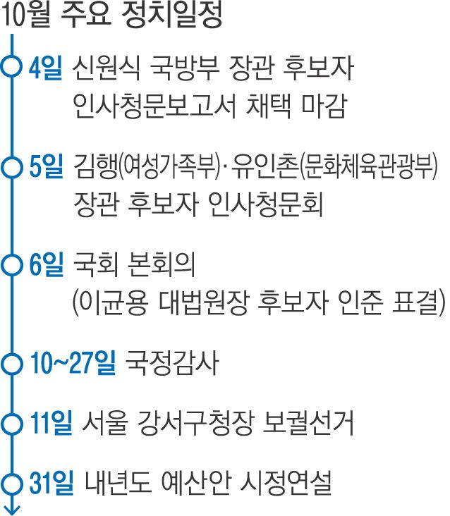 여야는 추석연휴가 끝나고 강 대 강으로 대치할 것으로 보인다. 당장 민주당은 오는 6일 예정된 국회 본회의에서 이균용 대법원장 후보자 임명동의안 부결을 시사하고 있다. 여야는 4일 신원식 국방부 장관 후보자 인사청문보고서 채택, 5일 김행 여성가족부·유인촌 문화체육관광부 장관 후보자 인사청문회를 두고도 대치할 것으로 전망된다. 오는 10일 시작되는 국정감사에서도 야당의 ‘정권 심판론’과 여당의 ‘야당 심판론’이 충돌할 수 있다. 민주당은 10월 국정감사가 끝난 이후에는 한동훈 법무부 장관 탄핵소추안을 발의할 가능성도 있다.
