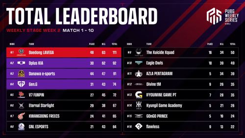 대동 라베가가 PWS 페이즈2 2주 2일차 경기에서 두 번의 치킨을 챙기며 1위를 기록했다. 1주차 아쉬운 모습을 보였던 대동 라베가는 2주 1일차를 1위로 마친데 이어 2일차에서 꾸준함을 보이며 최상단에 이름을 올렸다.