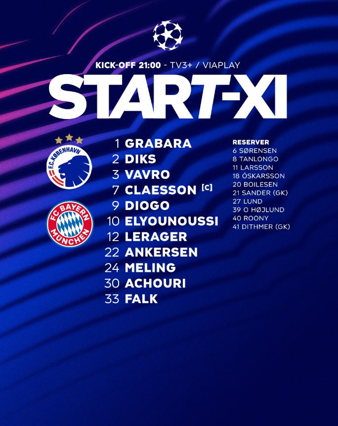 코펜하겐은 4-3-3으로 맞섰다. 카밀 그라바라가 골문을 지켰고, 비르예르 멜링, 케빈 딕스, 데니스 바브르, 페테르 안케르센이 백4를 형성했다. 중원엔 디오구 곤살베스, 라스무스 폴크, 루카스 레라허가 맡았고, 최전방에서 엘리아스 아슈리, 빅토르 클라에손, 모하메드 엘류누시가 뮌헨 골문을 노렸다.