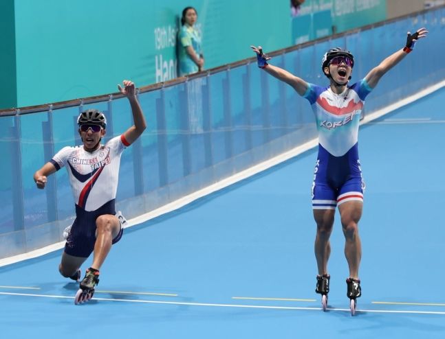 2일 중국 저장성 항저우 첸탕 롤러스포츠 센터에서 열린 항저우 아시안게임 롤러스케이트 남자 스피드 3000m 계주 결선에서 한국 마지막 주자 정철원이 결승선 통과에 앞서 세리머니를 하고 있다. 연합뉴스 |