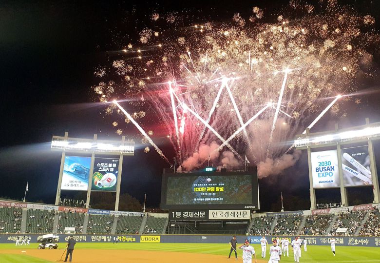 서울 잠실야구장에서 지난 22일 열린 프로야구 '2023 신한은행 SOL KBO리그' LG트윈스와 NC 다이노스의 경기 클리닝 타임 중 LG트윈스 홈경기 15번째 100만 관중 달성 축하 불꽃놀이가 펼쳐지고 있다. /뉴스1