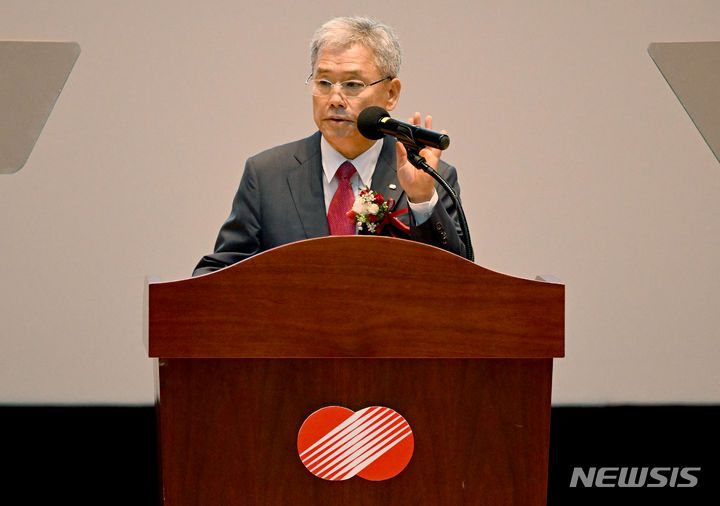 [나주=뉴시스] 김혜인 기자 = 김동철 제22대 한국전력 사장이 20일 오전 전남 나주시 빛가람동 한전전력공사 1층 한빛홀에서 열린 취임식에서 취임사를 하고 있다. 2023.09.20. hyein0342@newsis.com