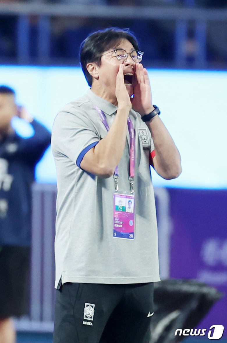 4일 오후 중국 항저우 황룽 스포츠센터 스타디움에서 열린 2022 항저우 아시안게임 남자 축구 대한민국과 우즈베키스탄의 4강전에서 대한민국 황선홍 감독이 작전을 지시하고 있다. 2023.10.4/뉴스1 ⓒ News1 민경석 기자 |