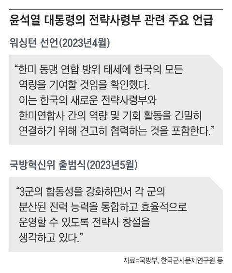 지난 4월 ‘워싱턴 선언’에서도 이를 의식한 듯 “한미동맹 연합방위 태세에 한국의 모든 역량을 기여할 것임을 확인했다”며 “한국의 새로운 전략사령부와 한미연합사 간의 역량 및 기회 활동을 긴밀히 연결하기 위해 견고히 협력하는 것을 포함한다”고 명시했다. 김선호 국방개혁전략포럼 대표(전 수방사령관)는 “핵전쟁 발발 시 (미래)연합사보다는 미 전략사 및 인태사령부가 전쟁 수행 주도 사령부 역할을 할 가능성이 있다”며 “우리 전략사가 미 전략사 및 인태사령부의 카운터 파트 역할을 수행할 수 있을 것”이라고 말했다.