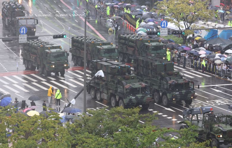 지난달 26일 서울 세종대로에서 열린 건군 75주년 국군의 날 기념행사일 시가행진에서 장거리 지대공 유도무기(L-SAM), 고위력 현무 미사일, 타우러스, 중거리 지대공미사일 천궁 등으로 구성된 3축 체계 장비들이 행진하고 있다. 북한의 핵·미사일 발사 대응을 위한 3축 체계는 킬체인(Kill Chain), 한국형미사일방어체계(KAMD), 대량응징보복체계(KMPR)로 이루어져 있다./연합뉴스 |