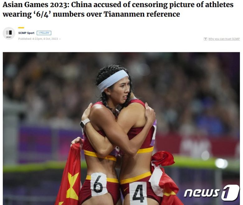 (서울=뉴스1) 박형기 기자 = 2022 항저우 아시안게임에서 중국 여자 육상 금메달 선수가 2위로 골인한 자국의 동료 선수와 포옹하는 사진이 현지 관영 매체에서 돌연 삭제돼 검열 논란이 일고 있다고 홍콩의 사우스차이나모닝포스트(SCMP)가 5일 보도했다.