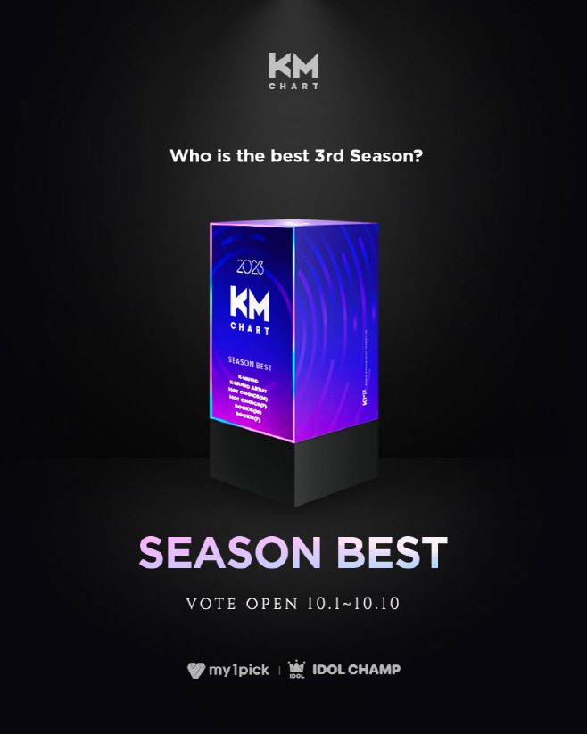 KM차트 3분기 시즌베스트 선호도 조사는 10일까지 마이원픽, 아이돌챔프 앱에서 참여가 가능하며 시즌 베스트 선호도 조사가 끝난 이후에는 심사위원단 심사 평가와 KM차트 집계, 선호도 조사 결과를 바탕으로 11월 초 KM차트 공식 유튜브 채널에서 시즌 베스트 시상이 실시간으로 진행될 예정이다.