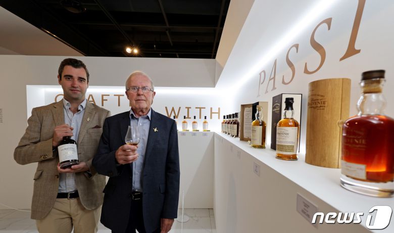 (서울=뉴스1) 장수영 기자 = 6일 오전 서울 강남구 앤드티리메타에서 열린 싱글몰트 위스키 발베니 60년 출시 기념 헤리티지 전시에서 데이비드 스튜어트(오른쪽) 몰트 마스터와 찰리 멧칼프 글로벌 앰베서더가 전시된 위스키 앞에서 포즈를 하고 있다. 2023.10.6/뉴스1