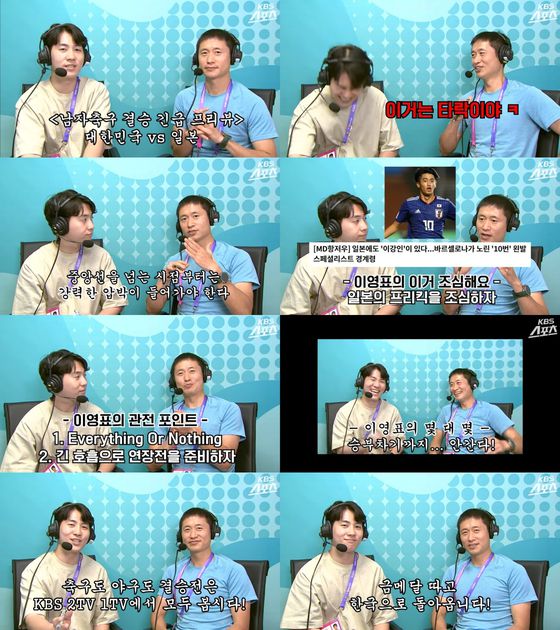 2018 자카르타-팔렘방 아시안게임에 이어 결승전에서 한국과 리매치를 벌이게 된 일본에 대해 이영표 위원은 “생각보다 약하다는 느낌을 받았다”고 이전 경기 직관 소감을 밝혔다. 그러면서 “일본의 최대 장점은 포지셔닝인데, 중앙선을 넘는 시점부터 강력한 압박을 하고, 그 동안의 경기보다 한 템포 빠른 압박 타이밍을 잡아야 한다”고 대표팀에 조언했다. 또 일본의 수비 패턴을 상세히 설명하고 “일본의 프리킥을 조심하라”고도 당부했다.