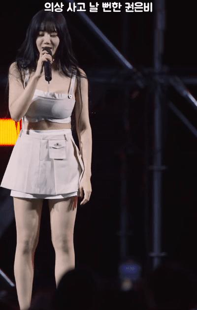 의도치 않은 노출에 객석은 웅성거리기 시작했다. 하지만 권은비는 슬쩍 멋쩍은 웃음을 지으면서도 침착하게 옷을 정리하며 위기를 모면했다.