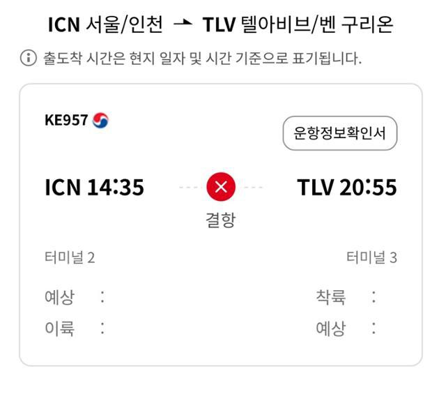 대한항공은 9일 오후 2시 35분 인천에서 이스라엘 텔아비브로 출발할 예정이던 KE957 항공편을 결항 조치했다고 8일 밝혔다. 이스라엘 체류객의 귀국을 돕기 위해 9일 텔아비브를 떠나 인천으로 향하는 인천 KE958 항공편은 하루 늦춰 운항할 예정이다. 대한항공은 이날 오후 홈페이지와 애플리케이션(앱)을 통해 '현지 정세 불안으로 이스라엘 항공편의 비정상 운항이 예상된다'고 공지했고, 오후 4시 관계자들이 모여 결항 여부를 놓고 논의한 것으로 전해졌다.