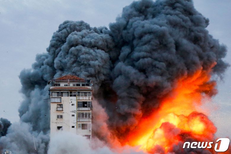 7일(현지시간) 반격에 나선 이스라엘 군이 가자 지구의 높은 빌딩을 공격하고 있다. ⓒ 로이터=뉴스1 ⓒ News1 박형기 기자 |