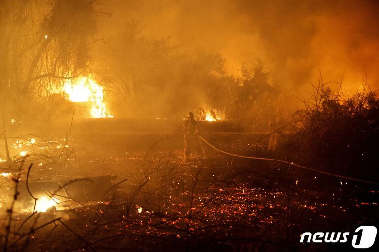 7일(현지시간) 하마스 공격으로 불타고 있는 이스라엘. 소방대원이 화재를 진압하기 위해 고군분투하고 있다. ⓒ 로이터=뉴스1 ⓒ News1 박형기 기자