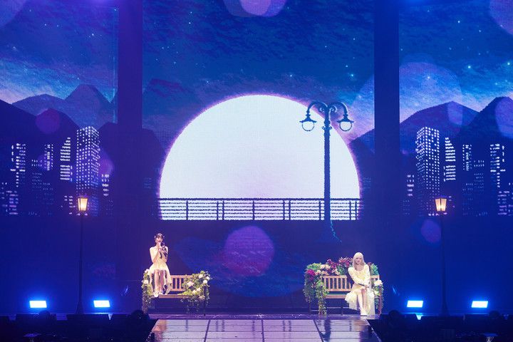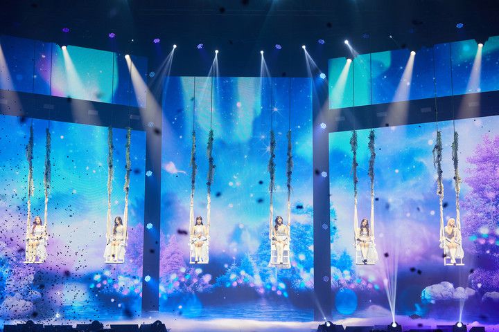 이어 숲속 정원이 열리는 듯한 연출로 시작한 팬 송 'Shine With Me'(샤인 위드 미) 무대는 중앙 무대 천장 위 아찔하게 매달린 대형 그네에 앉은 멤버들의 모습으로 놀라움을 안겼다.