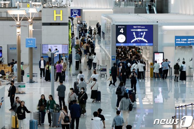 (영종도=뉴스1) 안은나 기자 = 9일 오후 인천국제공항 1터미널에서 승객들이 출국수속을 밟고 있다.   대한항공은 팔레스타인 무장 정파 하마스와 이스라엘의 전면전이 격화됨에 따라 이날 출발 예정이던 인천발 텔아비브 항공편을 운항하지 않기로 했다. 2023.10.9/뉴스1  Copyright (C) 뉴스1. All rights reserved. 무단 전재 및 재배포,  AI학습 이용 금지.