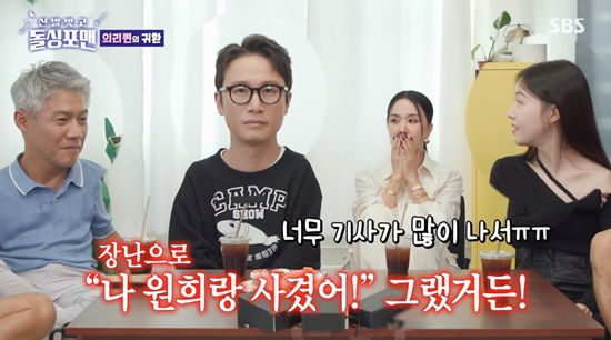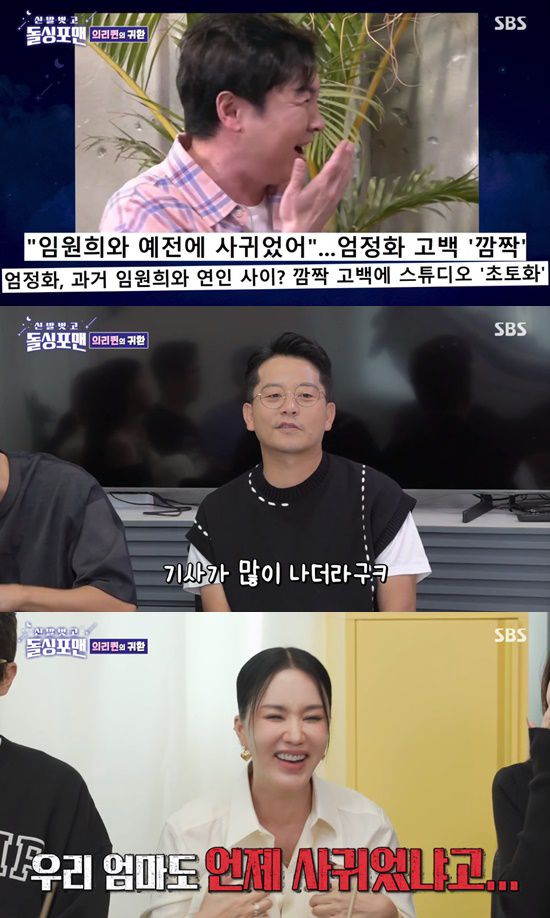 엄정화는 "전에 나왔을 때 장난으로 '원희랑 사귀었다'고 했더니 기사가 너무 많이 났다. 우리 엄마도 언제 사귀었냐고 묻더라"고 토로했다.
