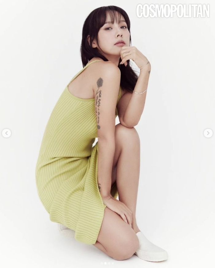평소 요가로 다져진 군살 없는 탄탄한 몸매는 전성기 시절 그대로의 모습이다. 그의 팔과 어깨에 새겨진 다양한 타투가 눈길을 사로잡는다..