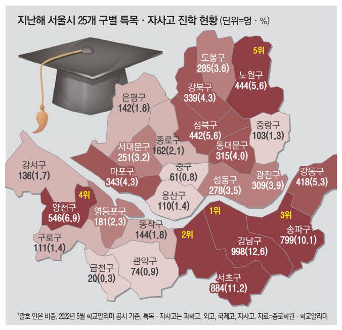 강남권 학교뿐 아니라 그동안 내신 점수를 따기 어려웠던 외국어고, 국제고, 영재고 등 특수목적고등학교(특목고) 쏠림 현상이 심화될 것으로 전망되면서 중학생 때부터 미리 특목고 진학률이 높은 대치동으로 진학하는 움직임이 늘어날 것이라는 관측도 제기된다. 종로학원이 학교알리미 공시를 통해 서울시 25개 구별로 지난해 특목고와 자율형사립고에 진학한 현황을 분석한 결과, 대치동이 속한 강남구에서 998명이 특목·자사고에 입학한 것으로 조사됐다. 서울시에서 특목·자사고에 입학한 7895명 가운데 12.6%가 강남구 출신인 것이다. 강남구에 이어 국내 대표 학군지로 꼽히는 강남 3구인 서초구와 송파구, 목동이 속한 양천구와 학원 밀집지역인 노원구 순으로 나타났다.