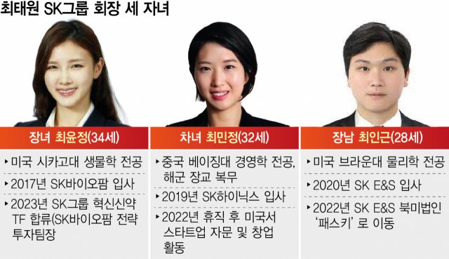 최 회장의 자녀들은 그룹 계열사에서 근무하며 물밑 경영 수업을 받고 있다. 장녀인 최윤정 SK바이오팜(326030) 전략투자팀장은 올해 3월부터 SK와 SK바이오팜이 꾸린 신약 개발 태스크포스팀(TF)에서 업무를 하고 있다. 차녀 민정 씨는 SK하이닉스(000660) 소속이지만 지난해 휴직계를 낸 후 미국 샌프란시스코에서 스타트업 자문 및 창업 활동을 하고 있는 것으로 알려졌다. 장남인 최인근 SK E&S 매니저는 북미 법인인 패스키에서 글로벌 에너지솔루션 사업에 참여하고 있다.