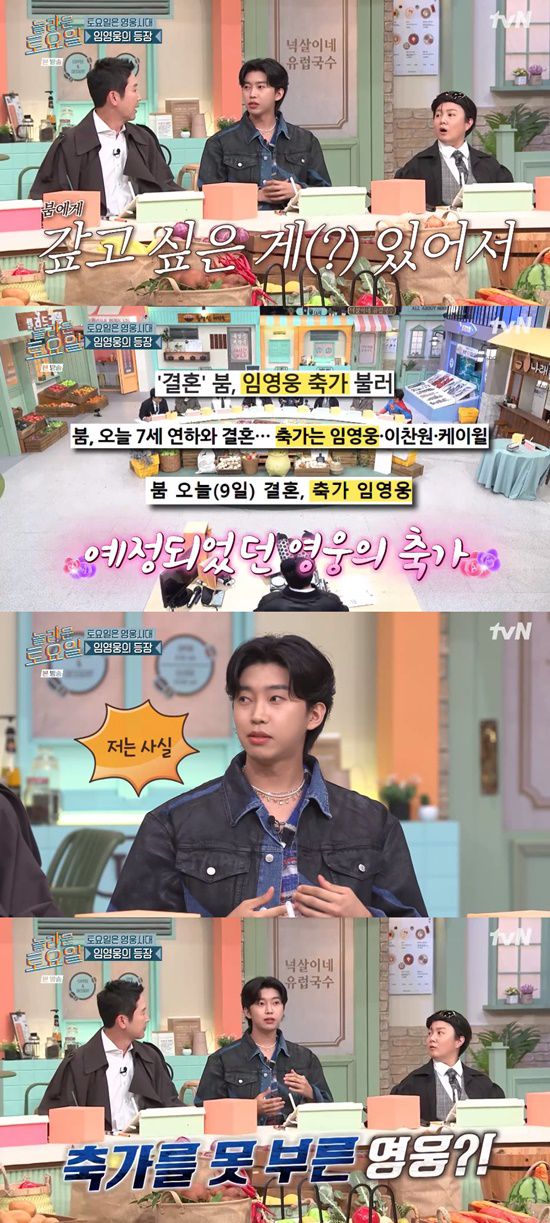 14일 방송된 tvN '놀라운 토요일'에서는 임영웅이 게스트로 출연했다. 임영웅은 "즐겨보는 프로그램인데 애정하는 붐 형님이 있어서 나왔다. 너무 보고 싶었다"고 했다.