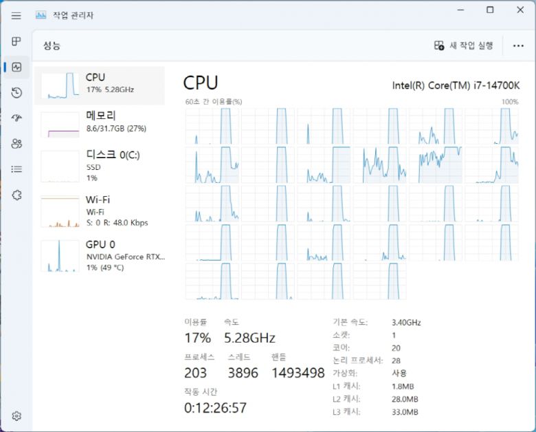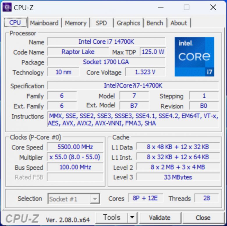 코어 i7-14700K는 8개의 P코어와 12개의 E코어로 구성되어 총 스레드 수는 28개다. P코어는 기본 3.4GHz, 맥스 부스트 5.5GHz, 인텔 터보 부스트 맥스 3.0은 5.6GHz로 작동하며, E코어는 기본 2.5GHz, 맥스 터보 4.3GHz로 작동한다. |