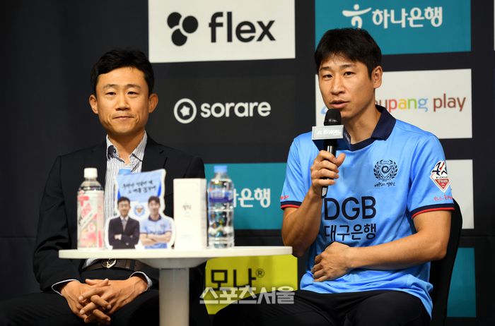 대구 최원권 감독과 이근호가 18일 서울 용산 나인트리 프리미어 로카우스 호텔에서 열린 K리그1 2023 파이널라운드 미디어데이 행사에서 질문에 답하고 있다.2023. 10. 18.최승섭기자 thunder@sportsseoul.com |