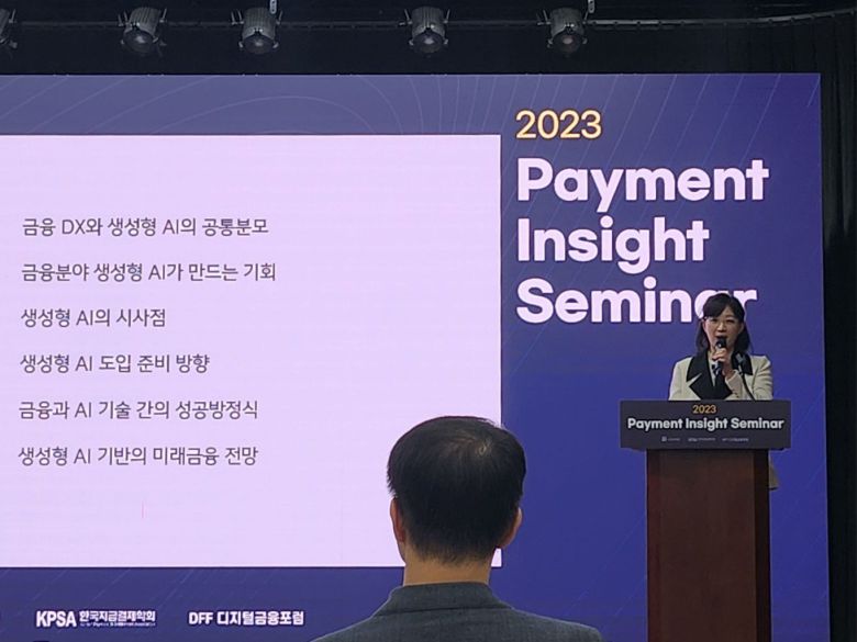 오순영 KB국민은행 금융AI(인공지능)센터장이 18일 서울 중구 은행회관에서 열린 ‘2023년 금융결제 인사이트(Payment Insight) 세미나’에서 발언하고 있다. /정민하 기자 |