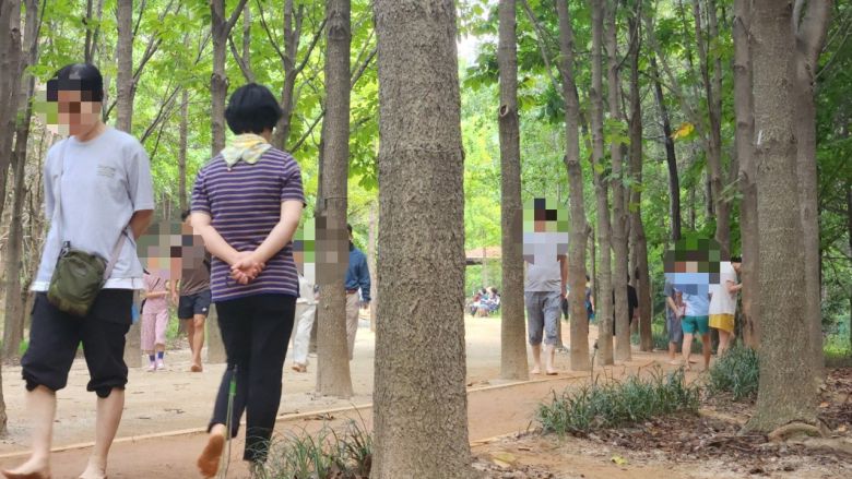 실외에서 운동화를 벗으니 처음에는 부끄럽다는 생각이 들었지만 걸을수록 그런 생각은 사라졌다. 곳곳에서 맨발로 흙을 느끼고 있는 시민을 만날 수 있었기 때문이다. 낯선 발바닥의 감촉도 어느새 편안하게 느껴졌다. 둘레길 입구에서 300m 정도 걸어 올라가자 산행하는 시민 5명 중 4명은 신발을 벗고 있었다.
