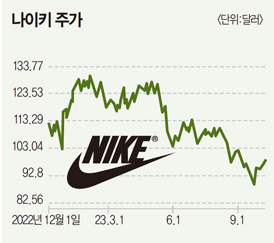 월가는 나이키 목표주가를 연일 끌어내리고 있다. 미국 경제 전문 매체 CNBC와 배런스 등에 따르면, 제프리스는 나이키 투자의견을 매수에서 보류로 강등했다. 목표가는 140달러에서 100달러로 대폭 하향했다. 현재 주가(97.62달러, 현지 시간 10월 10일 기준) 대비 상승 여력이 3% 수준에 불과하다. 이 회사의 랜달 코닉 애널리스트는 나이키의 2024년 회계연도 매출 전망치를 521억달러(약 71조원), 주당순이익은 3.45달러로 낮췄다.