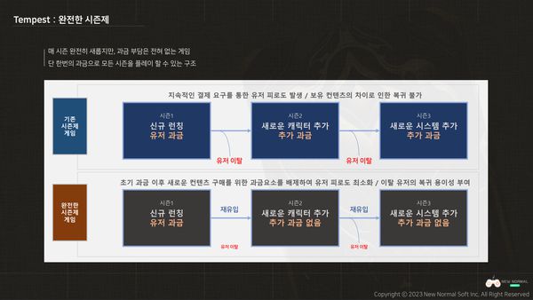 '템페스트'는 현재 단계에서 시즌3에 해당하는 콘텐츠가 기획된 상태다. 시즌1은 작품 론칭 및 신규 플레이어를 유입하는 단계이며, 시즌2에는 이전과는 전혀 다른 형태의 아키타입이 추가된다. 각 시즌은 6개월 단위로 진행된다. 그리고 새로운 시즌이 도입되기 두 달 전부터 다음 시즌 캐릭터를 순차적으로 선보인다. 이 과정에서 플레이어들이 신규 콘텐츠를 미리 체험해보고, 뉴노멀소프트는 피드백을 바탕으로 밸런스를 조정한다.