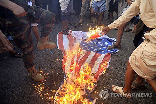 미국 국기 짓밟고 불태우는 친이란 예멘 시위대 |