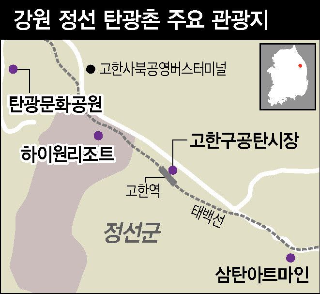 시장에서 차로 10여분 달리면 삼탄아트마인이 나타난다. 문화예술 공간인 삼탄아트마인에도 탄광과 광부의 흔적을 발견할 수 있다. ‘삼탄’은 대한민국 대표 탄광 중 하나였던 삼척탄좌를 말한다. ‘아트마인’은 탄광의 영어식 표기인 ‘콜 마인’(Coal Mine)에서 따온 이름이다. ‘석탄 대신 이젠 예술을 캔다’는 의미를 담고 있다. 1962년에 설립된 삼척탄좌는 이듬해 시험생산을 성공시키면서 1964년 본격적인 채광에 들어간 대단위 사업장이었다. 삼척탄좌의 주사업장인 정암광업소가 17개 광구를 소유하고 있을 정도로 규모가 컸다. 정선·삼척·영월 3개군에 걸쳐 총면적 3678ha에 이를 정도였다. 하지만 1980년대 이후 점차 채산성이 떨어지자 2001년 10월에 폐광했다.